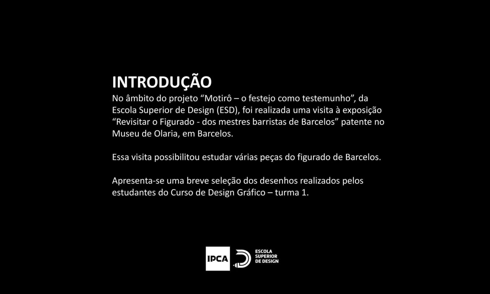 No âmbito do projeto “Motirô – o festejo como testemunho”, da Escola Superior de Design (ESD), foi realizada uma visita à exposição “Revisitar o Figurado – dos mestres barristas de Barcelos” patente no Museu de Olaria, em Barcelos. Essa visita possibilitou estudar várias peças do figurado de Barcelos. Apresenta-se uma breve seleção (PDF) dos desenhos realizados pelos estudantes do Curso de Design Gráfico – turma 1.